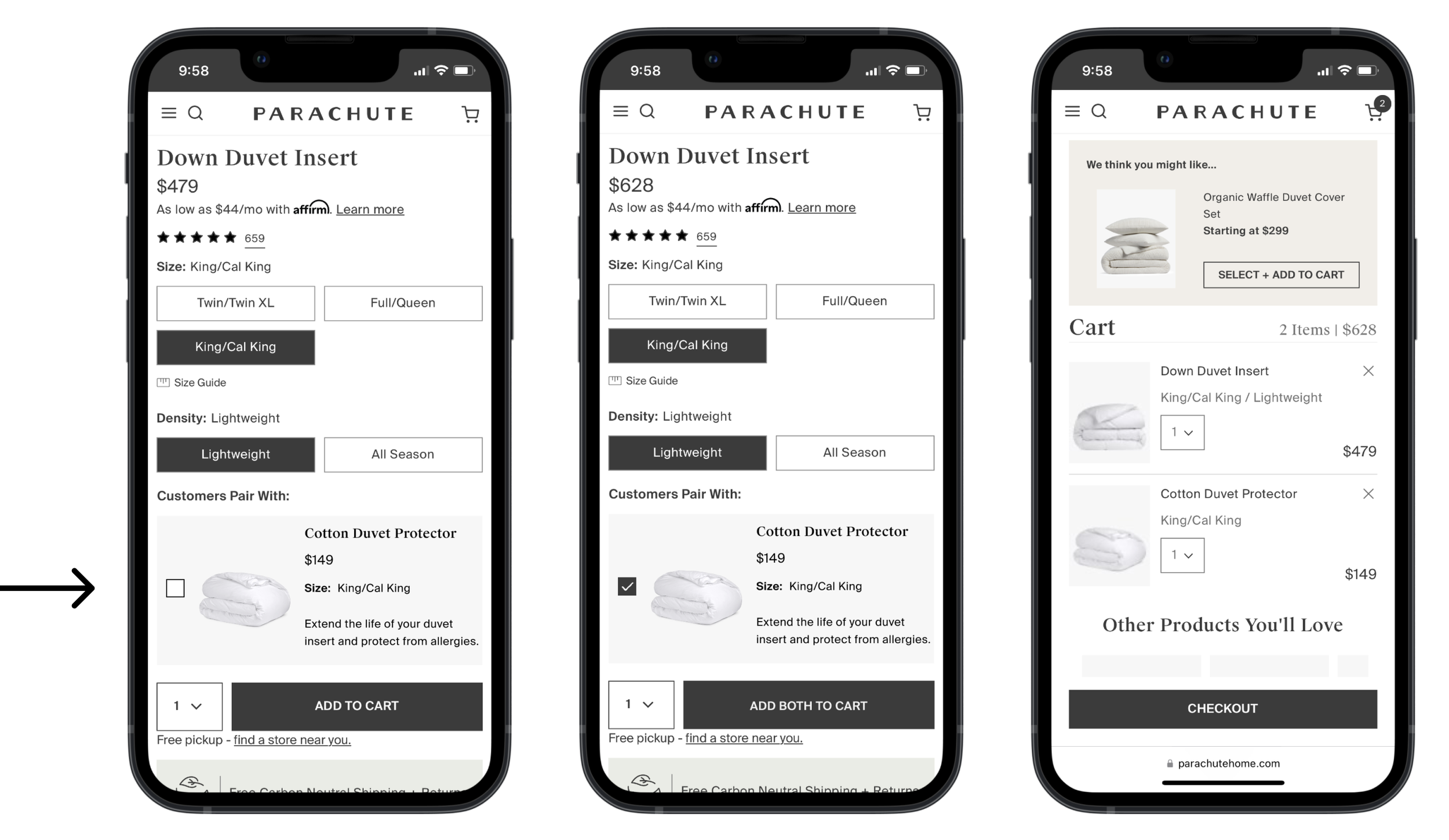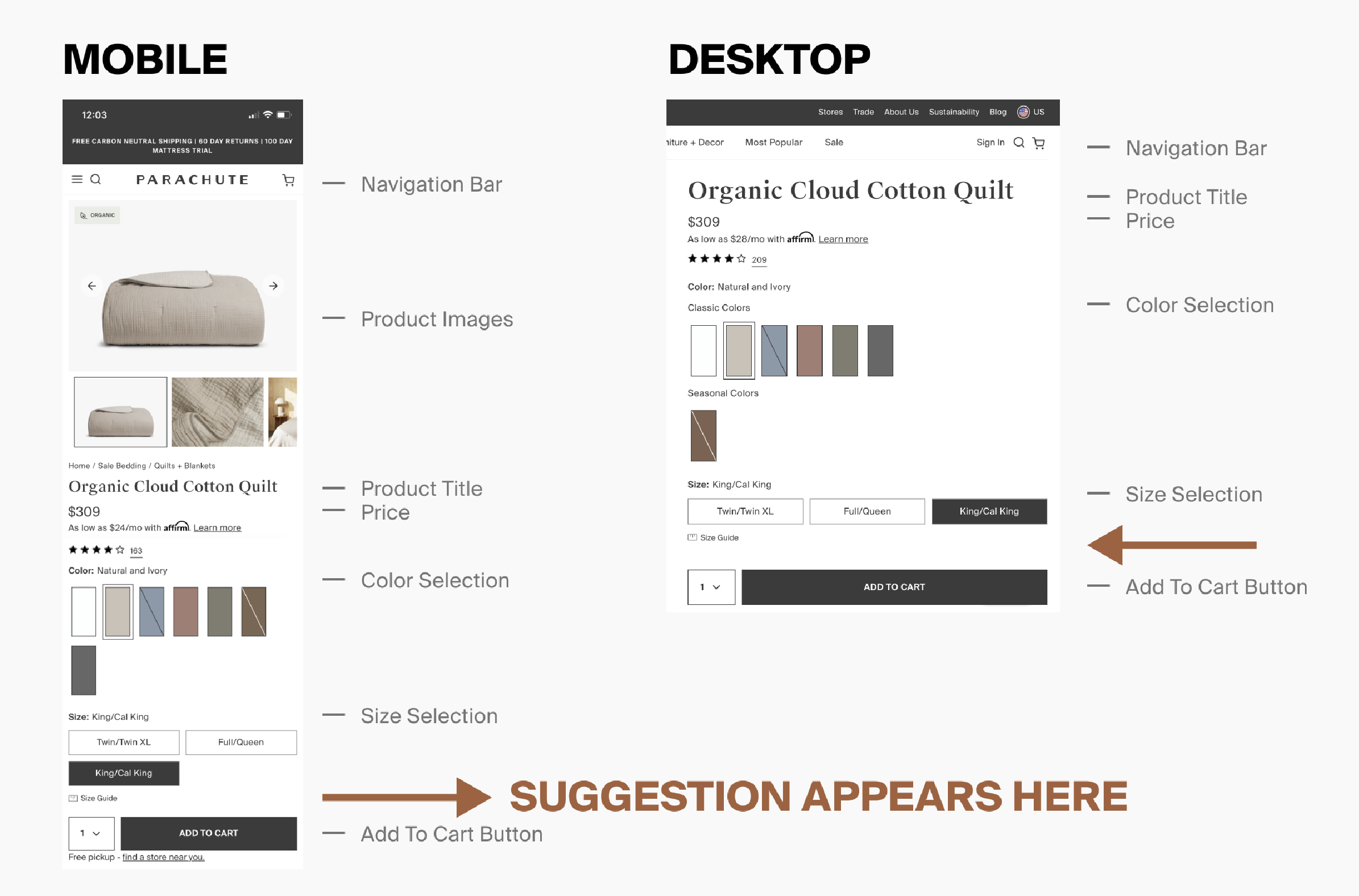 Synopsis: Parachute Home, a luxury soft-goods e-commerce business (best known for its bedding and bath products) is looking for a small but mighty update to their product detail pages (PDPs) to lift the average order value of online shoppers. After a year of customer insight at a Parachute Home location in Nashville, TN, I propose a new step in the user journey: to offer a suggestion.